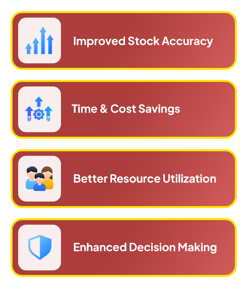 Improved Stock Accuracy: Maintains real-time inventory records, reducing manual errors, preventing stock mismatches, and ensuring departments always have required supplies available.
